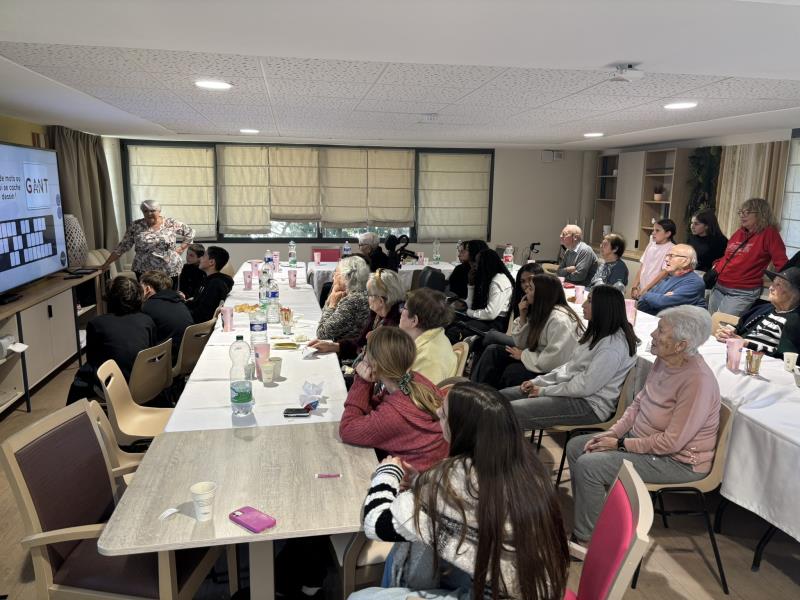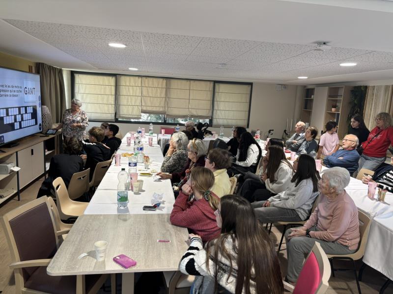 Une fois les appétits satisfaits, place au sport… cérébral ! Résidents et collégiens se sont retrouvés autour d’ateliers cognitifs sur la Wivy, une activité que nos résidents pratiquent régulièrement. Concentration, rires et esprit d’équipe étaient au rendez-vous.