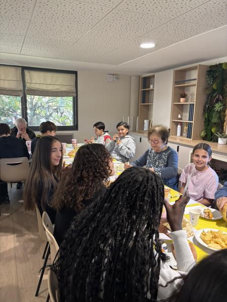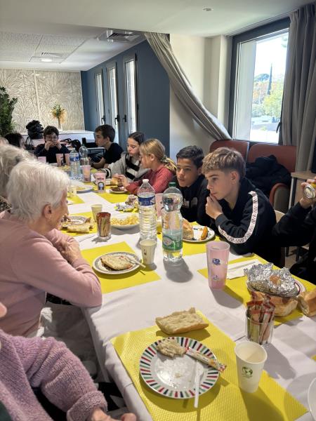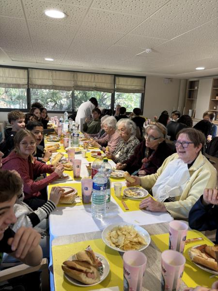 Cette année encore, nous avons eu le plaisir d’accueillir nos jeunes amis pour un déjeuner convivial placé sous le signe de la bonne humeur. Accompagnés de leurs professeurs de français, de sciences et vie de la Terre et d’italien, les collégiens ont partagé avec les résidents un pique-nique à l'intérieur très apprécié au menu : hot-dogs, ketchup et de mayonnaise, accompagnés de chips croustillantes, de Coca-Cola et, pour finir en douceur, une glace en dessert. De quoi ravir toutes les générations !