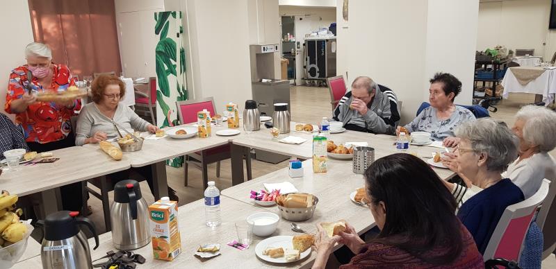 Les résidents qui avaient souhaité participer au petit déjeuner qui exceptionnellement se déroulait en salle de restaurant, prenaient place à 8h30 autour de la belle et grande table dressée pour l’occasion.
