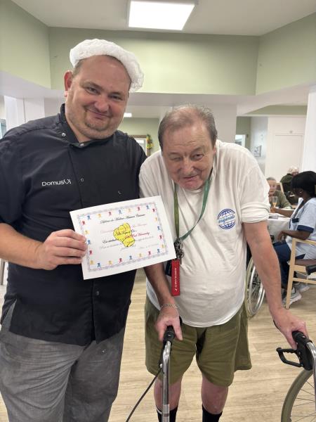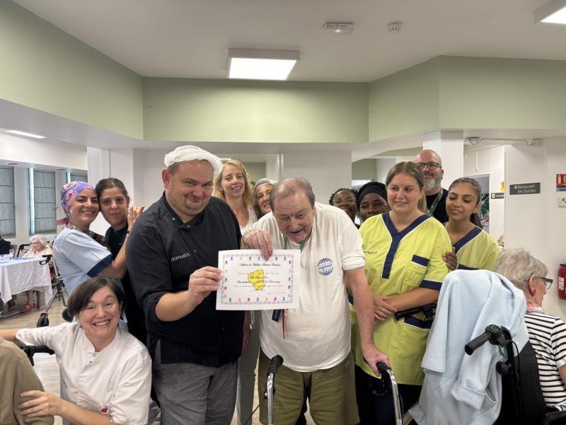 L’un de nos résidents, toujours enthousiaste à l’idée de donner un coup de main en cuisine, a été récemment mis à l’honneur. Il s’est vu remettre le diplôme de la Toque d’Or par notre chef Samuel, sous les applaudissements des autres résidents et des membres du personnel.